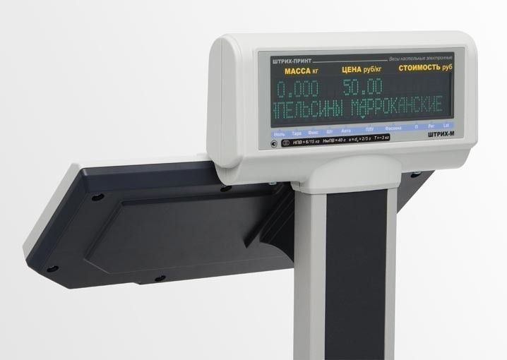 Дисплей весов Штрих-ПРИНТ V. 4.5 на две стороны и две строки вакуумно-флуоресцентного типа расположен сверху на стойке, что способствует удобству видения над витринами и холодильными камерами. На дисплей идет вывод стоимости, наименований товара, веса и других данных. Память весов рассчитана на базе из 22 000 товаров.
